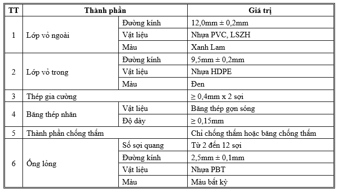 – Sợi quang được dùng là loại đơn mode – chiết suất bậc và là vật liệu thuỷ tinh chất lượng cao (Theo khuyến nghị ITU-T G.652.D và TCVN 8665: 2011).