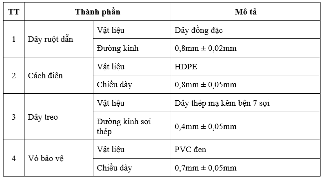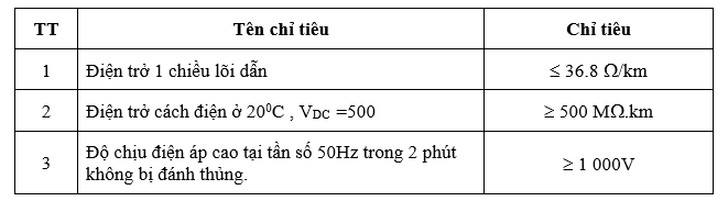 Cáp truyền thanhCáp truyền thanh dạng tròn Đã đăng trên 26/03/202017/04/2020 bởi telvina 26 Th3 -Cáp truyền thanh treo hình số 8, Công ty cổ phần Viễn thông Telvina sản xuất dùng để truyền tải tín hiệu âm thanh, lắp đặt treo ngoài trời, điện áp sử dụng 500V. Cấu trúc: Đặc tính điện: ******************************************************** telvina