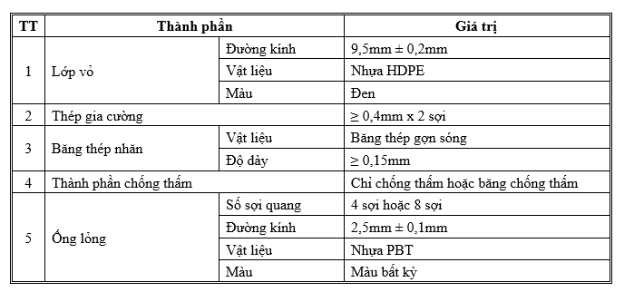 - Sợi quang được dùng là loại đơn mode – chiết suất bậc và là vật liệu thuỷ tinh chất lượng cao (Theo khuyến nghị ITU-T G.652.D và TCVN 8696: 2011).
